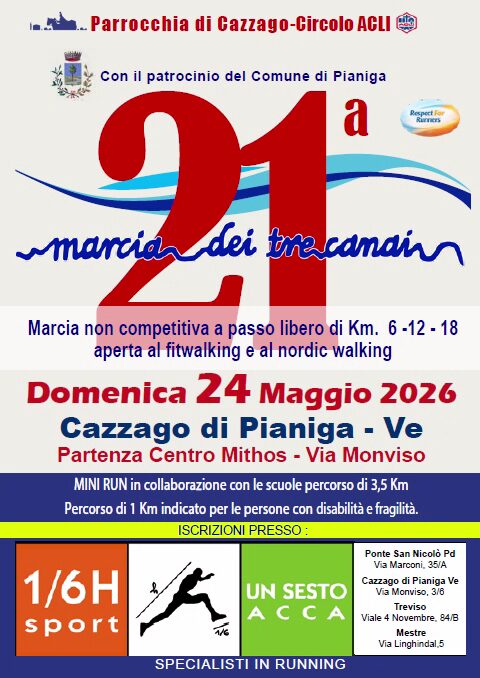 Domenica 24 maggio 2026 si svolge la 21^ edizione della “Marcia dei tre canai” a Cazzago di Pianiga (VE).