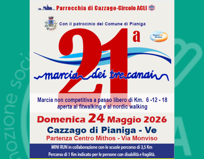 Domenica 24 maggio 2026 si svolge la 21^ edizione della “Marcia dei tre canai” a Cazzago di Pianiga (VE).